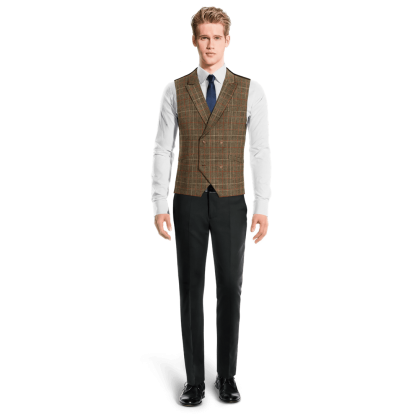 Brown Checkered Tweed peak lapel double-breasted Dress Vest with brass buttons