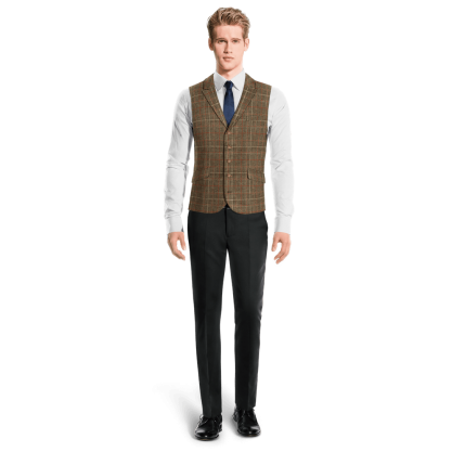 Brown Checked Tweed peak lapel Vest with brass buttons