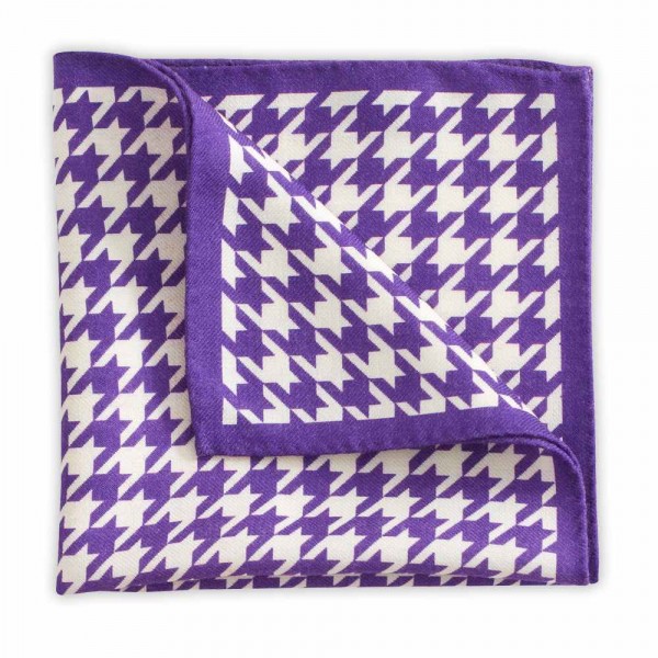 Add just the right final touch to your outfit with this handsome purple wool pocket square in a classic houndstooth pattern. Hand-rolled and hemmed. 12" x 12"